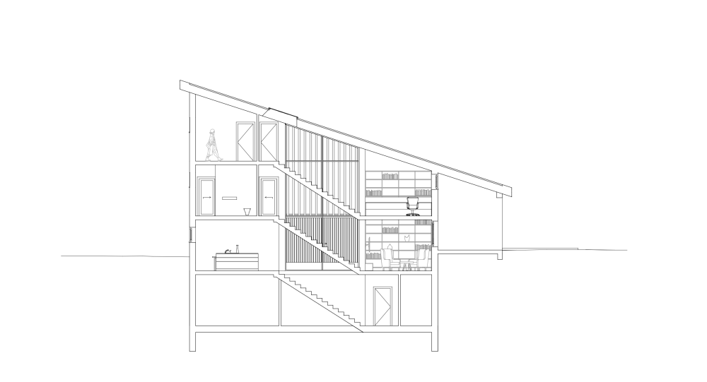 Die Bauordnung erlaubte ein Vollgeschoss, das Raumprogramm verlangte drei Ebenen. Das Pultdach bot die einzige konstruktive Strategie dafür. Daraus entsteht eine klare vertikale Sequenz: Wohnen unten, Schlafen dazwischen, Arbeiten oben. Kein Gestus – reine Notwendigkeit.