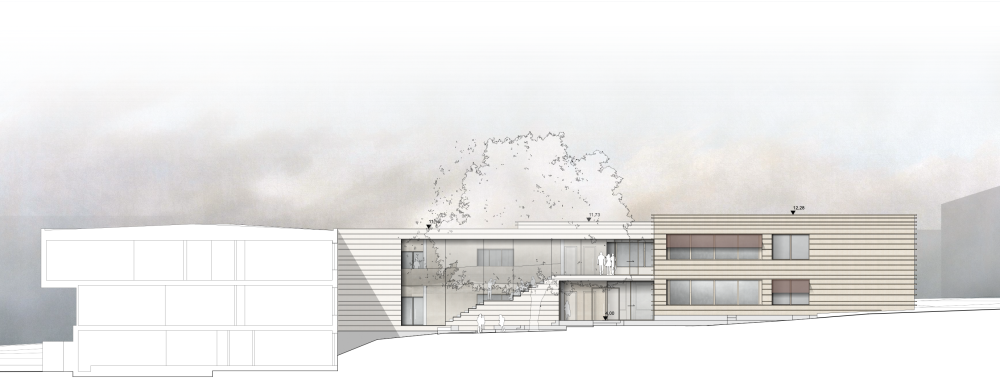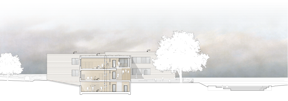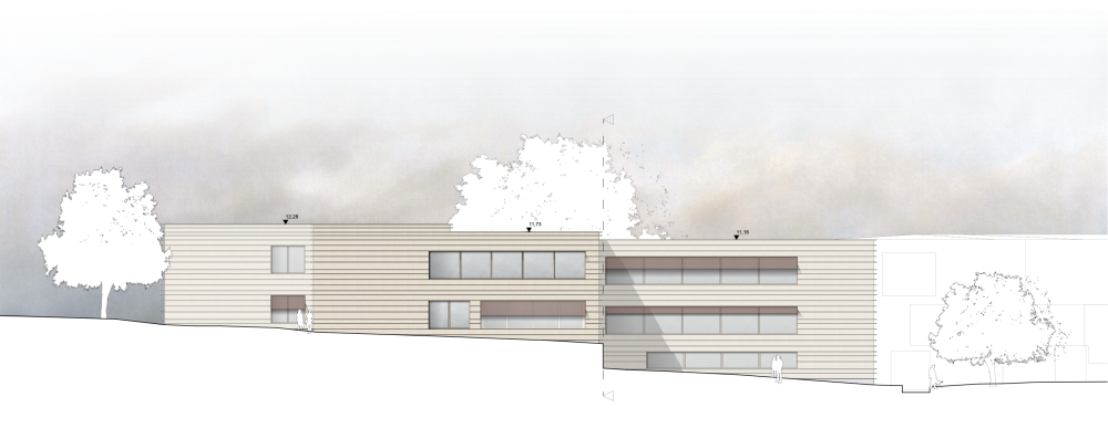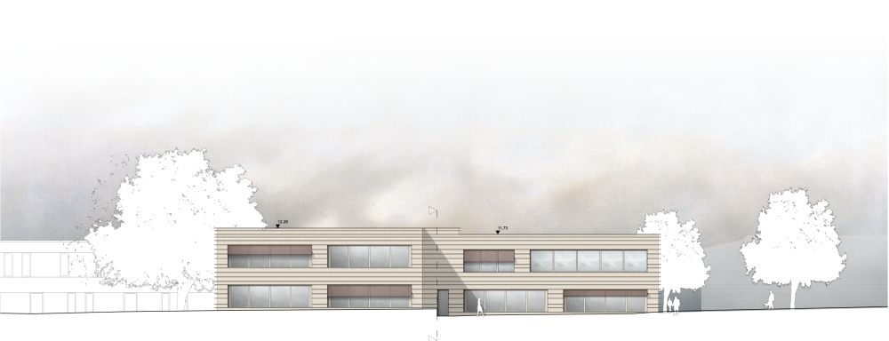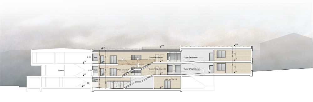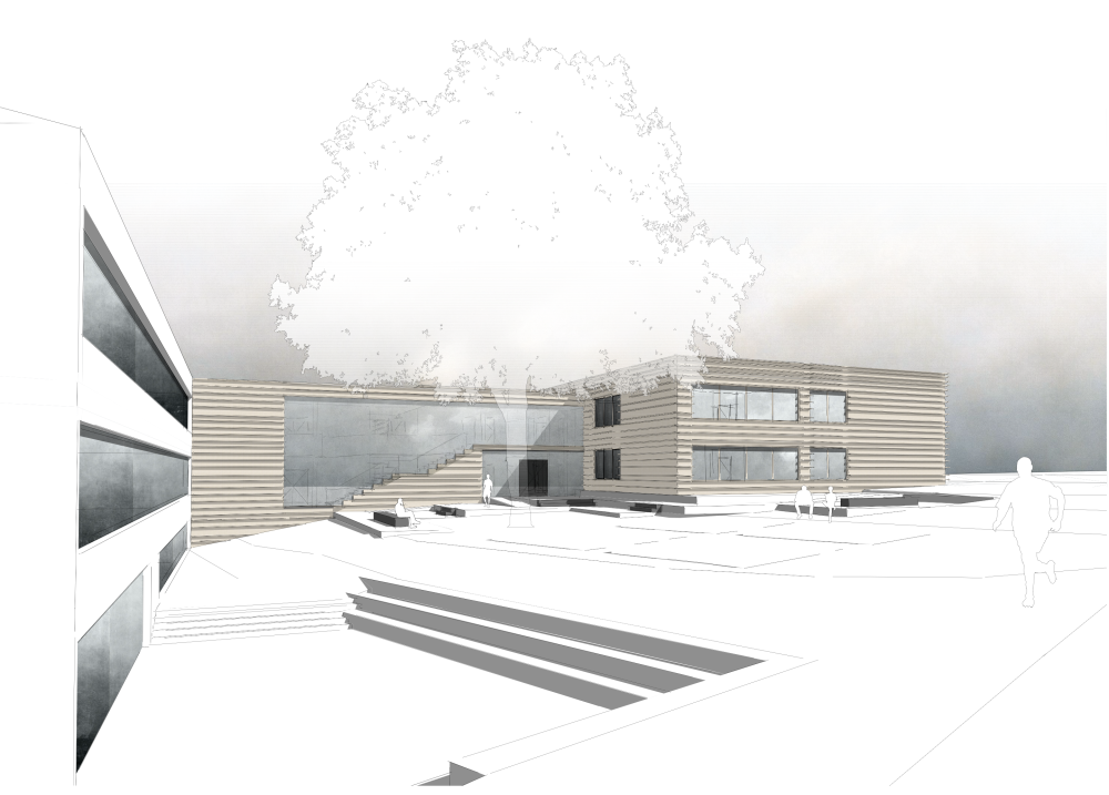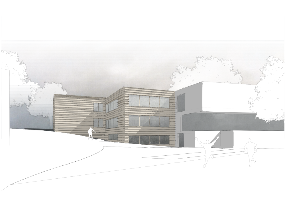 Der Neubau ergänzt das bestehende Schulgebäude als kompakter, eigenständiger Baukörper, der sich selbstverständlich in Struktur, Maßstab und Topografie einfügt. Durch die direkte Anbindung an den Bestand werden vorhandene Wege und Erschließungen fortgeführt und Eingriffe auf ein Minimum reduziert, sodass der Schulbetrieb während der Bauzeit aufrechterhalten werden kann.