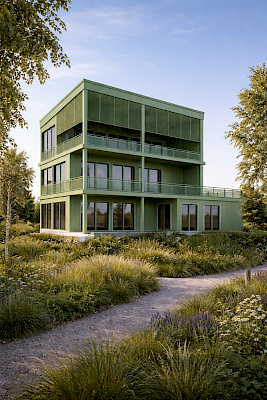 Die Fassaden sind in ihrer Schichtung differenziert ausgebildet. Vertikale Holzbekleidungen und fein strukturierte, vorgelagerte Elemente übernehmen sowohl konstruktive als auch klimatische Funktionen. Im obersten Geschoss filtert eine durchgehende Verschattung das Licht und vermittelt zwischen Offenheit und Schutz. Die Fassadenhaut ist bis zur Oberkante der Fenster geführt und verleiht dem Baukörper eine klare, horizontale Spannung.